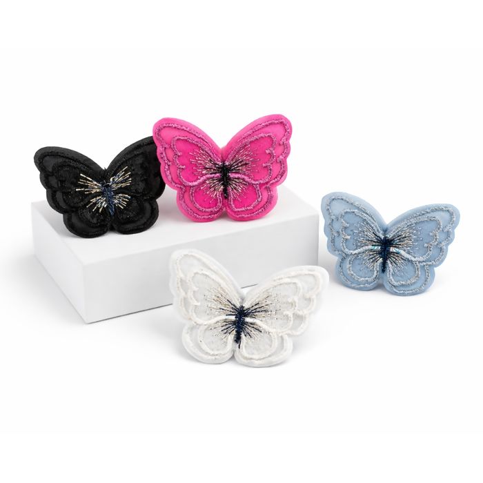 Aplique Borboleta em voal com 55 mm, ideal para dar um toque delicado e encantador às suas criações. Com cores variadas e acabamento leve, é perfeito para trabalhos artesanais, personalizados e acessórios, valorizando cada peça com mais charme e beleza.
