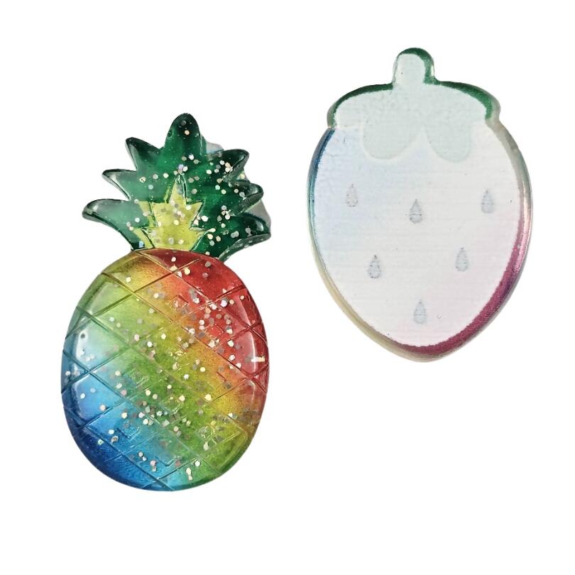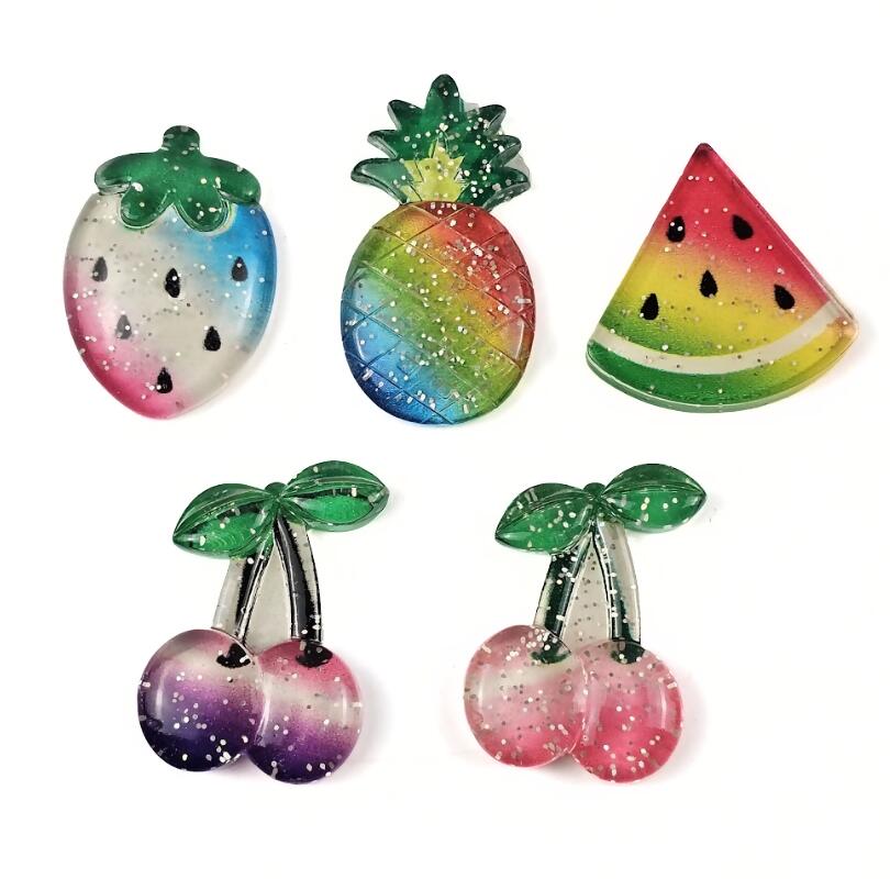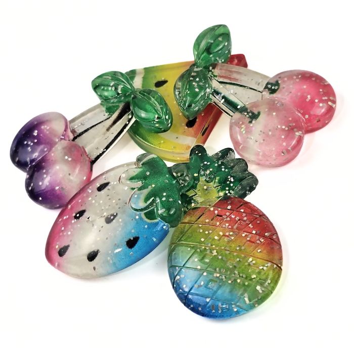 Aplique em resina no formato de frutas sortidas, medindo 30 mm. Embalagem com 20 unidades coloridas e divertidas, ideais para personalizar peças artesanais, laços e lembrancinhas.