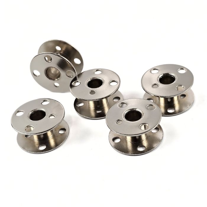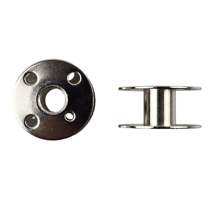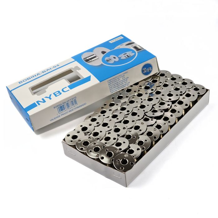 Bobina Baixa Caseira tamanho 04, confeccionada em metal com acabamento niquelado. Compatível com máquinas de costura domésticas, garante desempenho uniforme na formação da costura, Embalagem com 100 unidades.