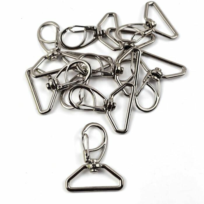 Fecho mosquetão modelo 1166 com base reta sextavada, medindo 30 mm, em acabamento niquelado. Embalagem com 10 unidades, ideal para bolsas, mochilas, chaveiros e artesanato.