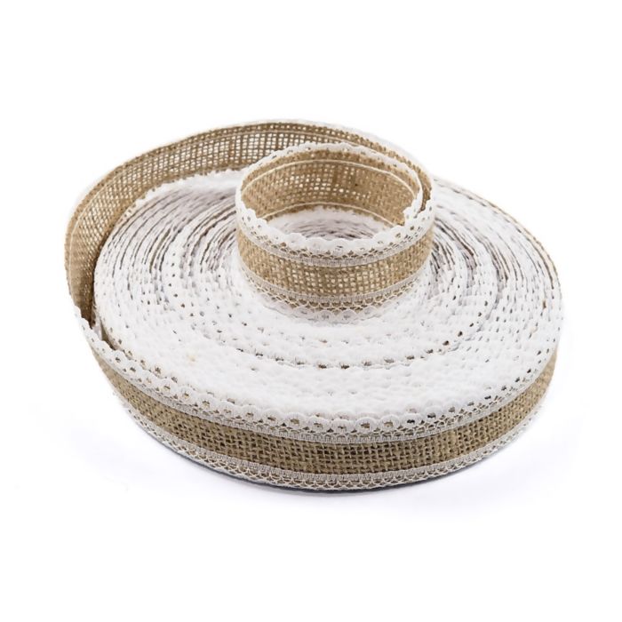 Descrição Fita De Juta Bege Com Renda Lateral Branca 35MM C/25 Metros