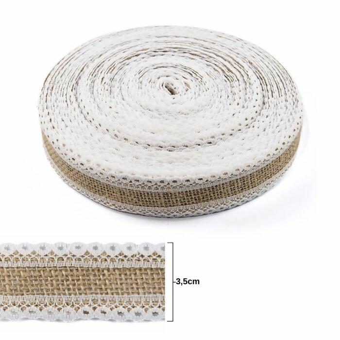 Fita De Juta Bege Com Renda Lateral Branca 35MM C/25 Metros