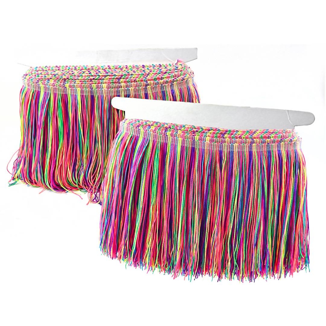 Franja de Tecido 20cm em rolo com 15 jardas, versão multicor, ideal para criar movimento e um acabamento impactante em peças de moda, fantasias e decoração. Ótima para customizações e detalhes que pedem destaque, com caimento leve e visual marcante.
