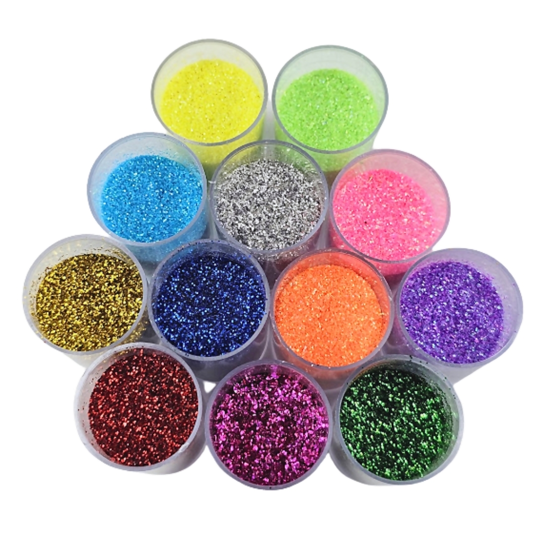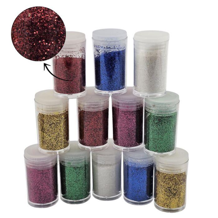Kit com 12 potinhos de glitter em cores sortidas, com brilho intenso e partículas finas. Ideal para artesanato, maquiagem artística, decoração de festas e projetos criativos. Prático, colorido e fácil de aplicar.