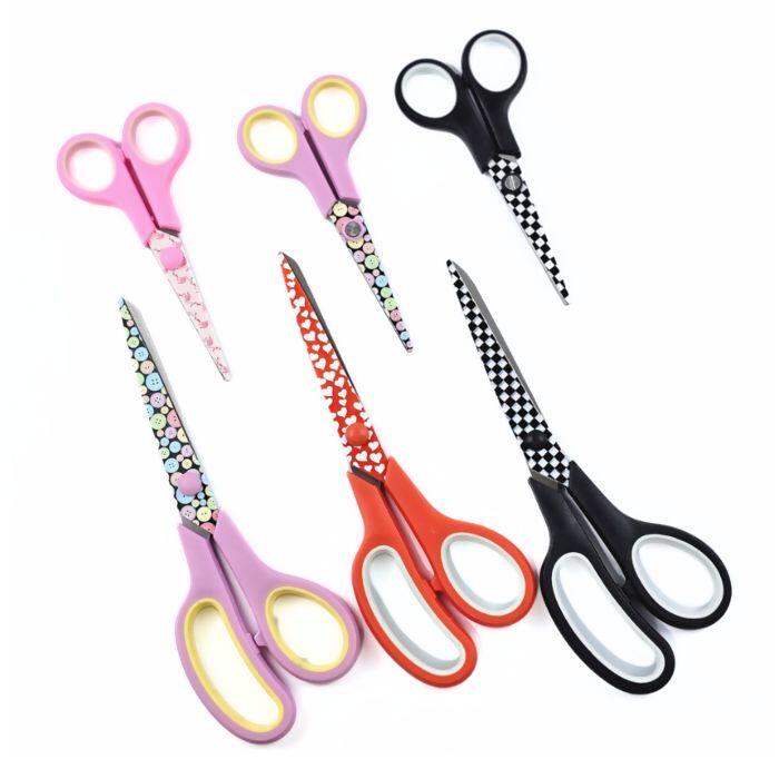 Conjunto com 3 tesouras de tamanhos variados (21,5 cm, 19 cm e 14 cm), ideal para costura e artesanato. Fabricadas com lâminas de aço inoxidável e cabos em plástico industrial resistente, oferecem cortes precisos e durabilidade. Estampas de oncinha adicionam estilo ao design funcional.