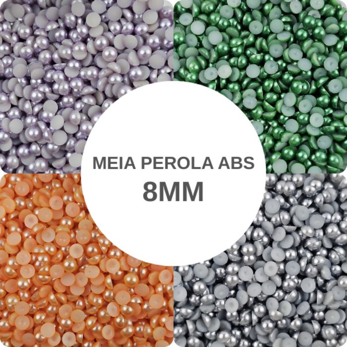Meia Pérola sem furo de 8 mm, acabamento liso e brilhante, ideal para colagens e aplicações artesanais. Pacote com 500g contendo centenas de unidades em cor sortida ou conforme o lote.