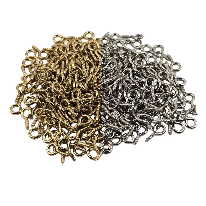 Mini pitão em ferro medindo 5x10 mm, resistente e versátil, ideal para fixação e penduração em peças artesanais e bijuterias. Embalagem com 2.000 unidades, perfeito para produção em larga escala.