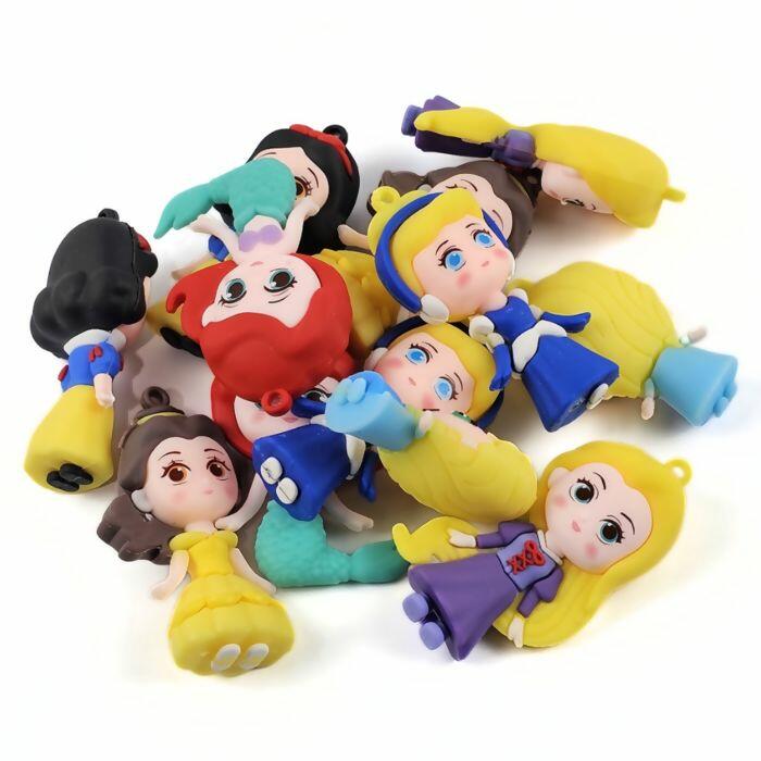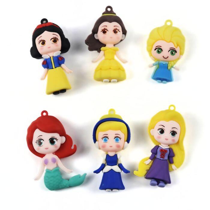 Conjunto de pingentes em PVC com o tema princesas, medindo aproximadamente 35mm cada. Apresenta design colorido e detalhado, ideal para personalizar artesanatos, acessórios e produtos infantis. Inclui 12 unidades de princesas variadas.