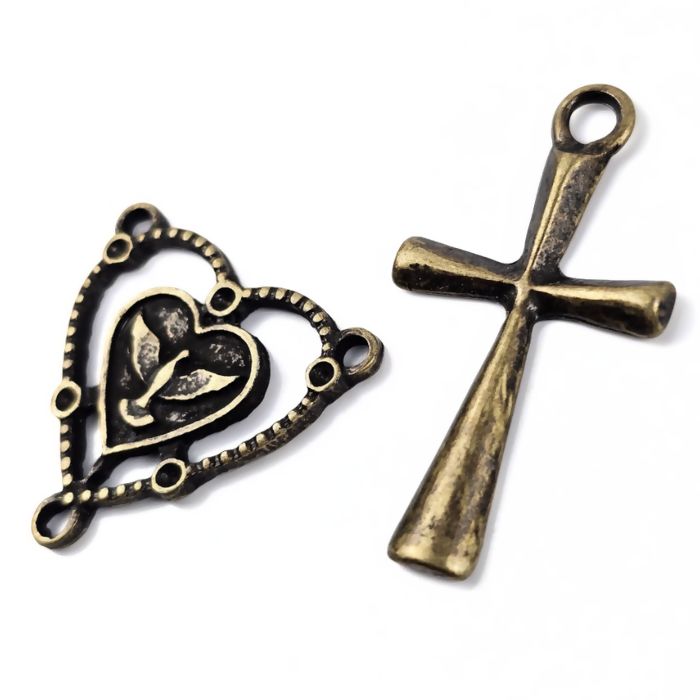Conjunto de pingentes em metal prateado com acabamento brilhante, composto por entremeio com imagem de Nossa Senhora e crucifixo com Cristo em relevo. Ideal para montagem de terços, colares religiosos e artesanatos católicos. Acompanha 10 pares (10 entremeios + 10 crucifixos) no tamanho grande, com detalhes bem definidos que valorizam o trabalho manual.