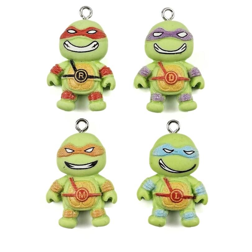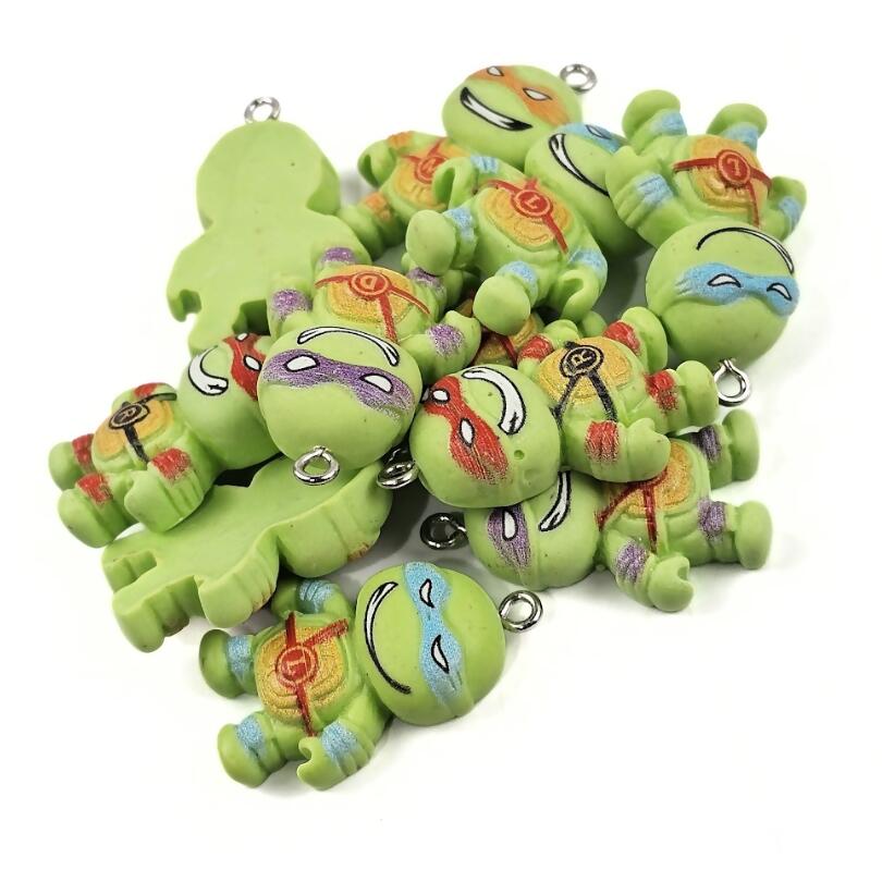 Pingente em resina no formato das Tartarugas Ninjas, medindo 18x22 mm. Embalagem com 50 unidades coloridas e divertidas, ideais para personalização de acessórios, lembrancinhas e artesanato infantil.