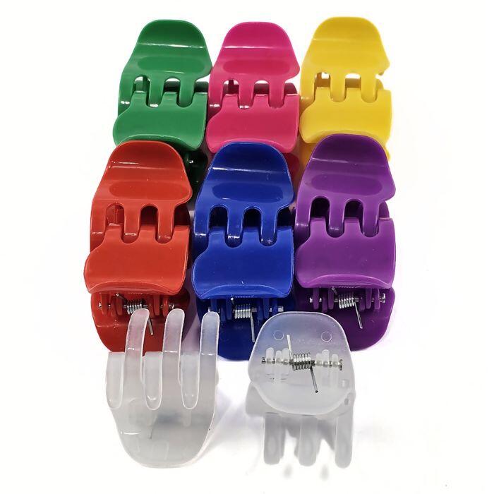 Piranha plástica tamanho médio, medindo 3x2,5 cm, resistente e prática para prender e modelar os cabelos. Embalagem com 12 unidades em cores sortidas, ideal para uso diário ou profissional.