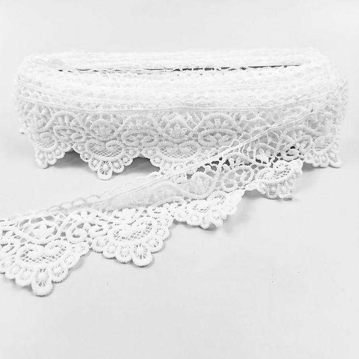 Renda Guipir 6,5cm em rolo com 15 jardas, ideal para acabamento elegante e sofisticado em roupas, lingerie e artesanato. Com renda encorpada e visual marcante, valoriza barras e detalhes, entregando um acabamento premium nas peças.