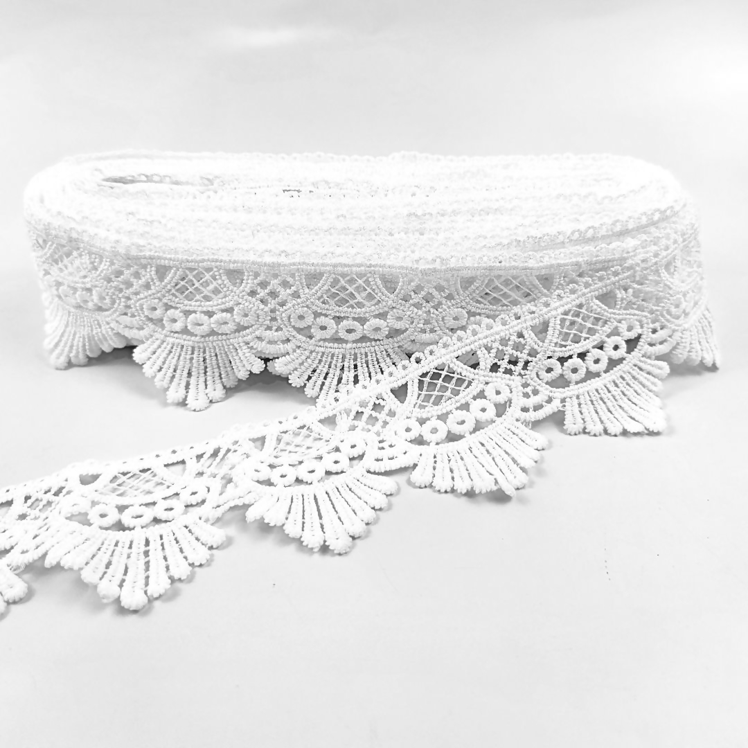 Renda Guipir 6cm em rolo com 15 jardas, ideal para acabamento elegante e sofisticado em peças de moda, lingerie e artesanato. Com renda encorpada e visual marcante, valoriza detalhes e proporciona um acabamento premium nas criações.